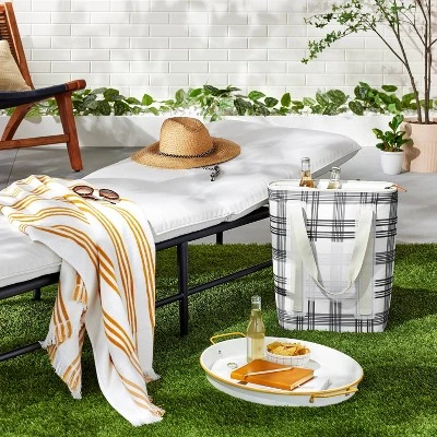 From chilling out in the backyard with friends to a picnic in the park, this Soft-Sided 19-Quart Plaid Backpack Cooler from Hearth & Hand™ with Magnolia will help keep your beverage cans at the right temp. This soft-sided backpack cooler comes with an outside storage pocket to help keep small items, and boasts a water-resistant design for convenient outdoor use. Covered with a plaid pattern in black, white and gray hues, this backpack cooler holds up to 20 beverage cans and allows easy carrying with the adjustable straps.